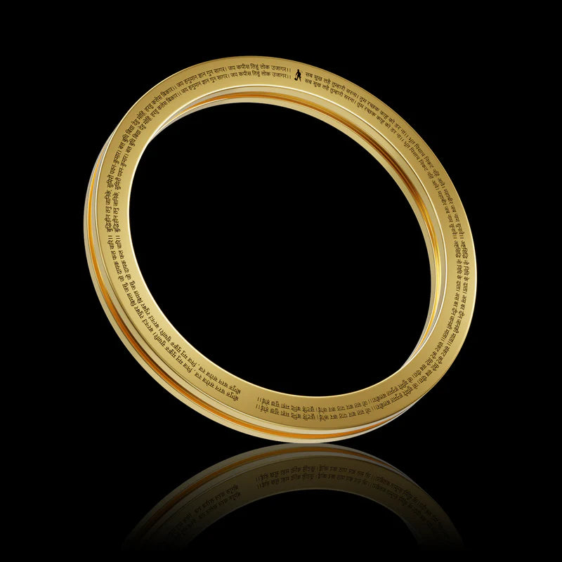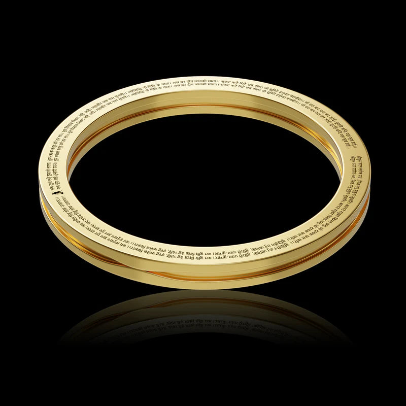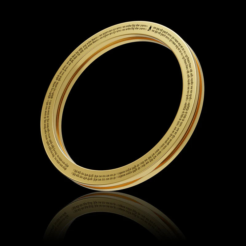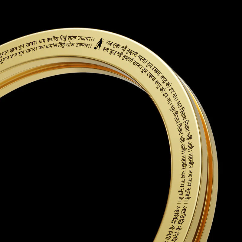 The Hanuman Chalisa Shakti Kada is a modern tribute to India’s timeless devotion and strength. Its iconic edges and shielded design embody the spirit of Lord Hanuman, bringing courage, protection, and resilience to your daily life. Crafted in 22-carat gold plated stainless steel, this closed bracelet carries engraved verses of the Hanuman Chalisa—connecting you to your faith while reflecting your inner power. Suitable for men, this kada comes in 2 sizes - medium and large.